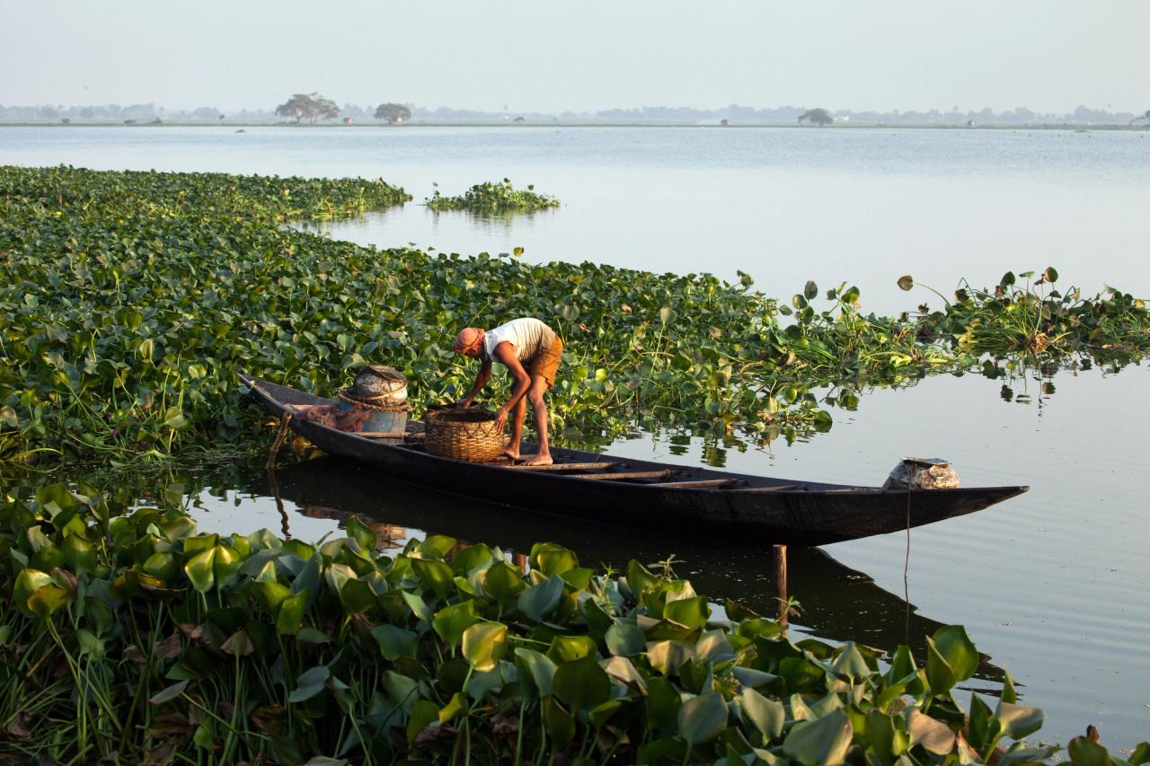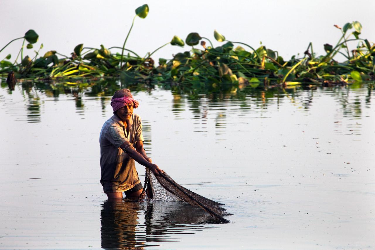 A fisherman collects fish in a basket in the East Calcutta Wetlands in Calcutta, India. (Courtesy Julia Watson)