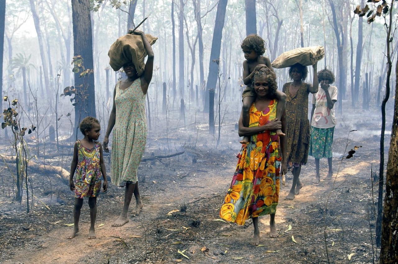 Aboriginal women return from gathering color and edible leaves in smoking wood after fire-stick burning. (Courtesy Julia Watson)