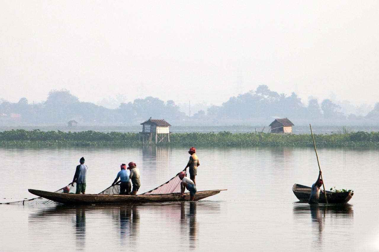 Fishermen tend a net in the East Calcutta Wetlands in Calcutta, India. (Courtesy Julia Watson)