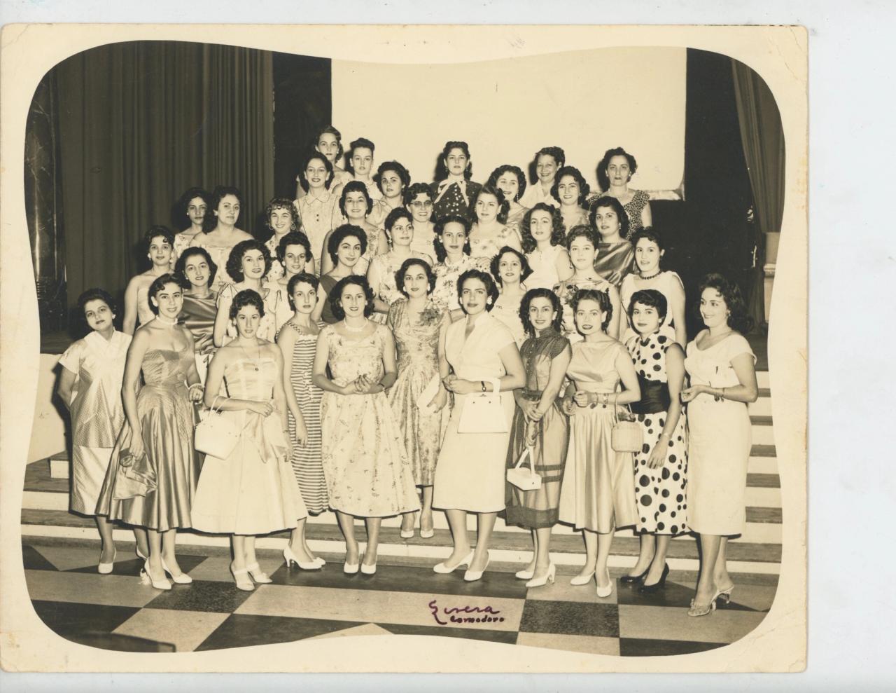 Fernández’s maternal grandmother and four great aunts in center foreground, with others, wearing dresses they designed and made after graduating from Maria Teresa Bello’s Couture School in Havana, Cuba.