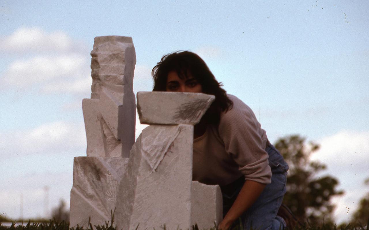 Fernández in Miami in 1989, during her undergraduate studies at Florida International University, assembling a marble sculpture. (Photo: Courtesy Teresita Fernández)