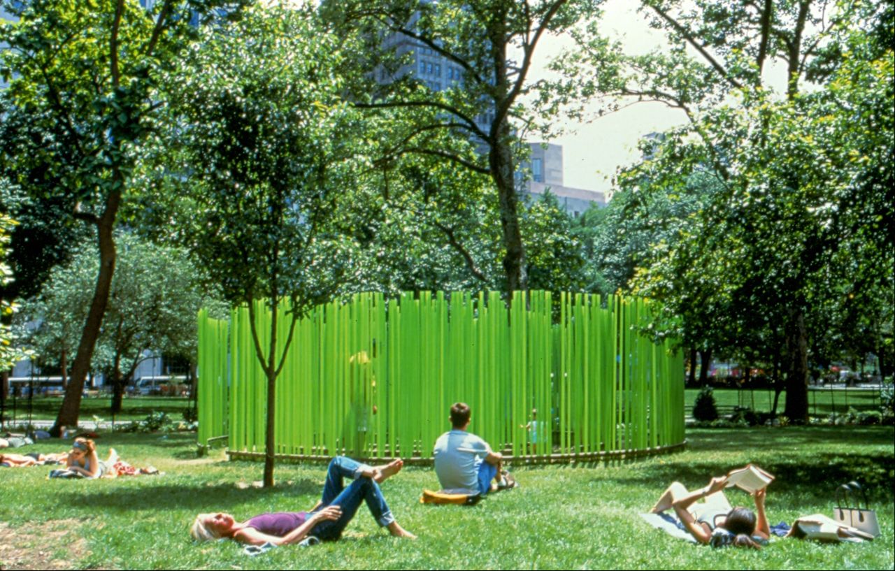Fernández's "Bamboo Cinema" (2001), made of polycarbonate tubes and stainless steel, at Madison Square Park in New York City.
