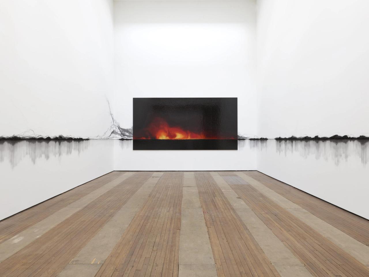 Installation view of Fernández's "Charred Landscape (America)" (2017), made with charcoal, at Lehmann Maupin gallery in New York.