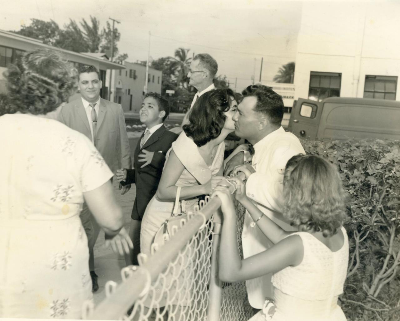 Fernández's family as recent Cuban exiles in Miami, in 1961, with her mother kissing her grandfather goodbye after her parents’ wedding. (Photo: Courtesy Teresita Fernández)