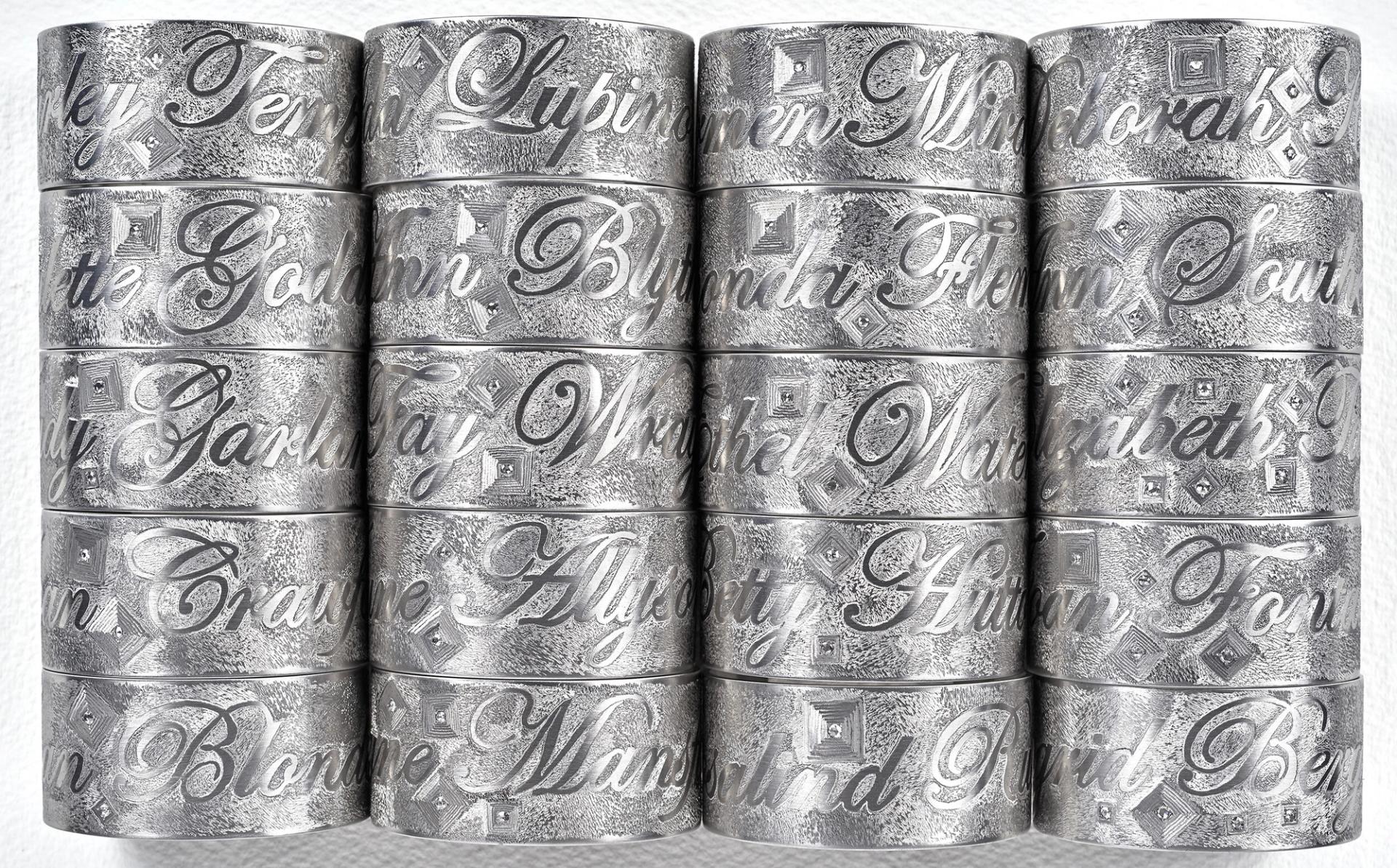 Brush’s Actresses series of cuffs, featuring the names of Lucille Ball, Jean Harlow, Betty Hutton, and other Hollywood stars of that time. (Courtesy Rizzoli Electa, Photo: Takaaki Matsumoto)