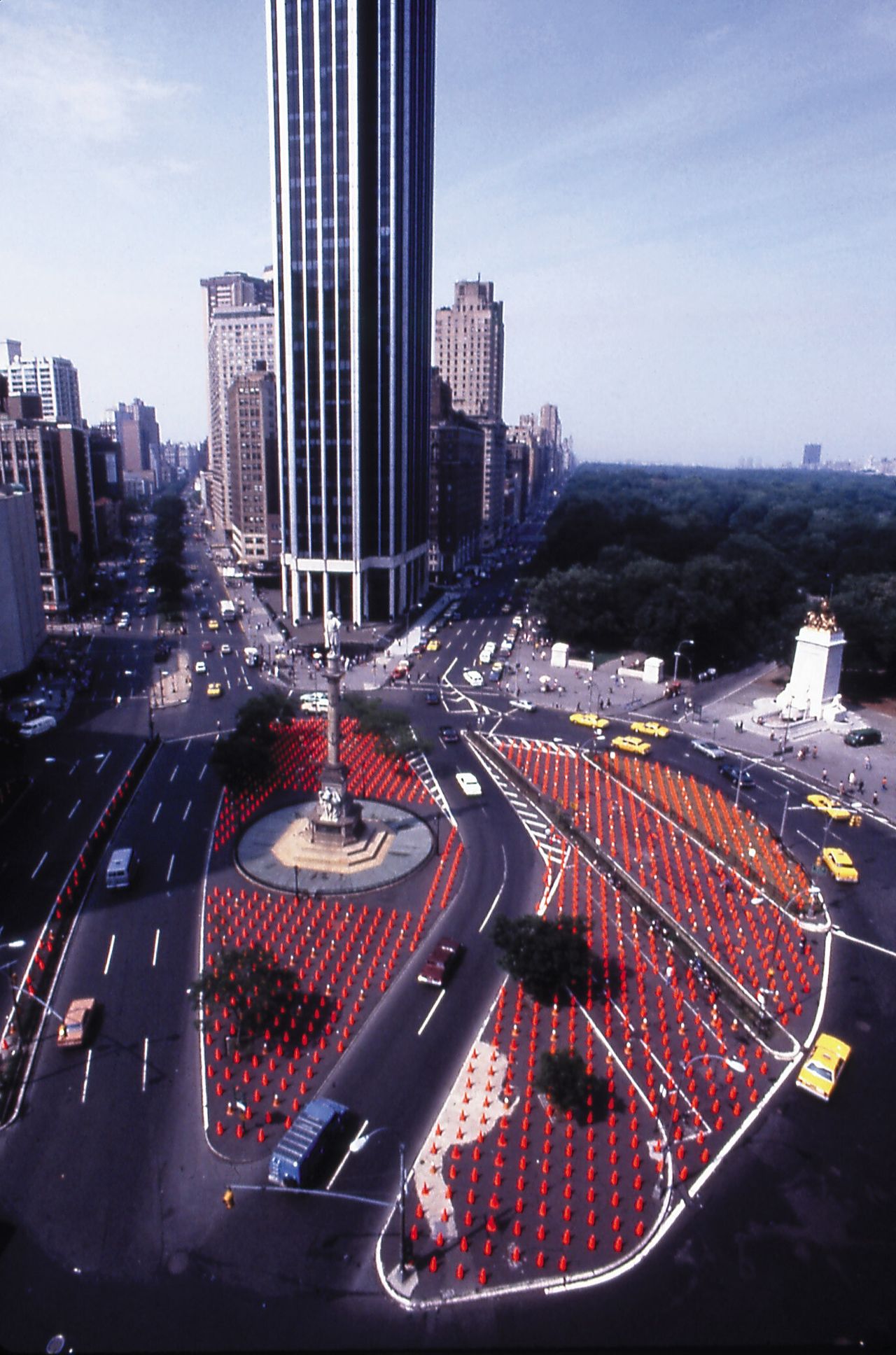 There were a lot of things that I wanted to explore, and that Ric and I wanted to explore together, as independently generated work. And based on salaries for teaching, and from the fellowships and grants, I wasn’t able to finance some of these projects. Most of them were on a credit card that I ended up having to pay off for [the] next ten years. But it allowed me to just have an outlet to do things. Like “Traffic,” which was one of the first independent projects that Ric and I did, in Columbus Circle. Just repositioning twenty five hundred traffic cones there, and sort of moving traffic around, and creating this field of color, using an indigenous material to the site.