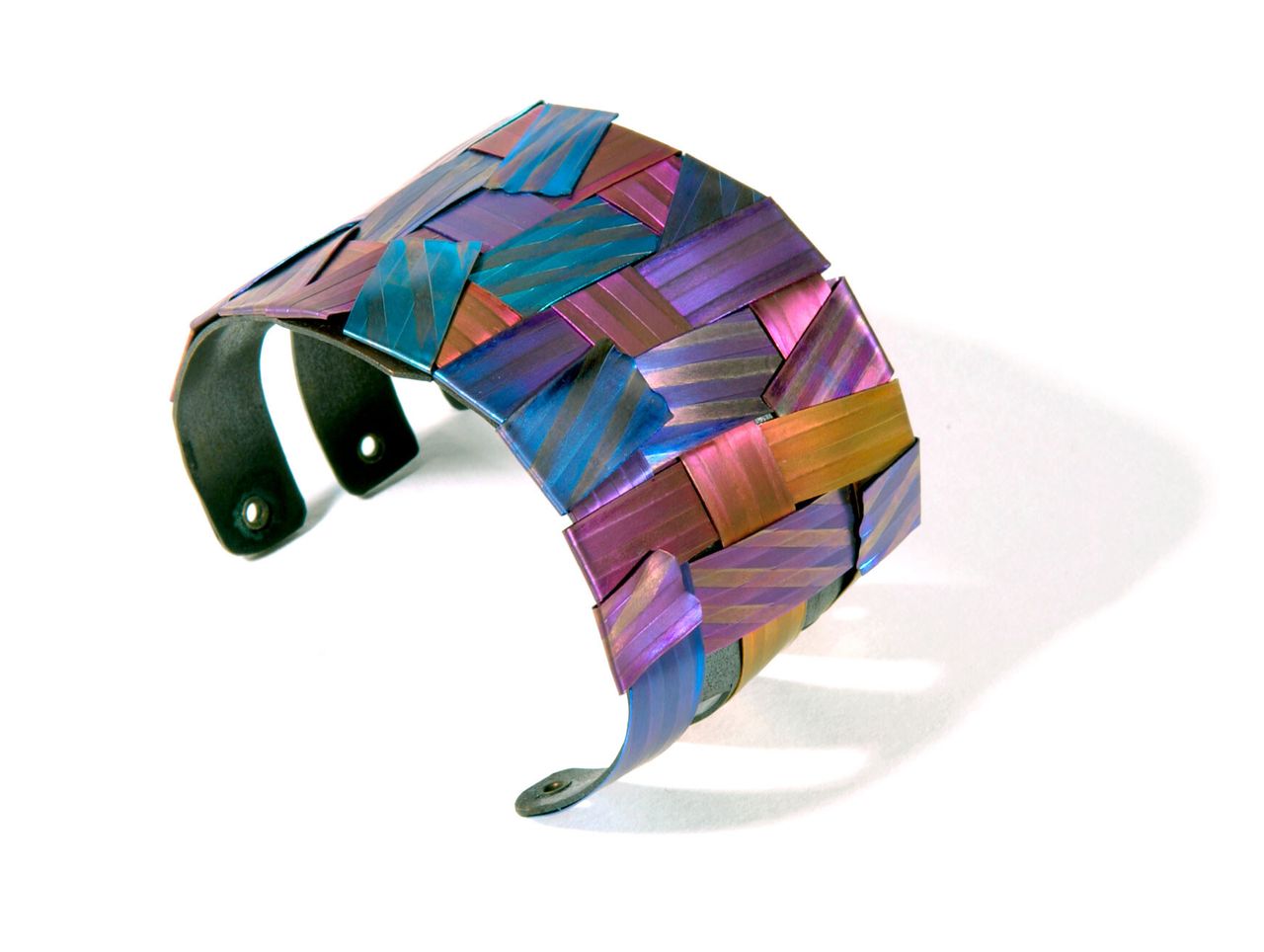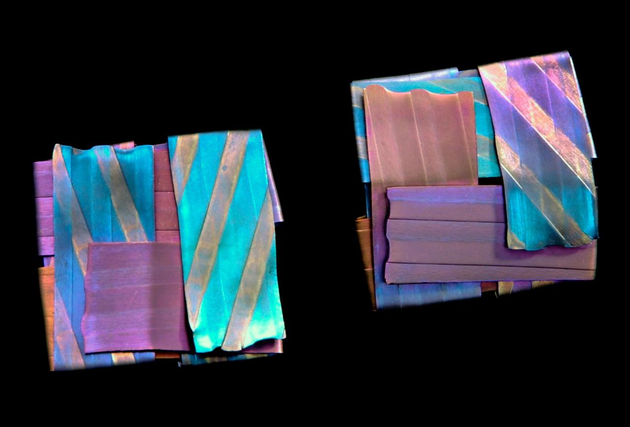 I would ask myself questions like, “Well, if it’s eighty volts at blue and fifty volts at orange, can I cut back through the oxide layer and see the spectrum of colors?” Which I guess nobody had ever asked, because people were just charging it at different voltages, but leave it to me, the curious kid, to want to know. I would spend hours in the studio trying to use different equipment to cut back through the oxide layer. One day—breakthrough!—it happened, and it created this ribbon-like texture.