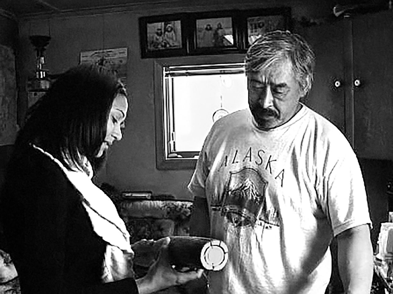 Péan visiting with a Native-Alaskan hunter in Shishmaref, Alaska. (Courtesy Monique Péan)