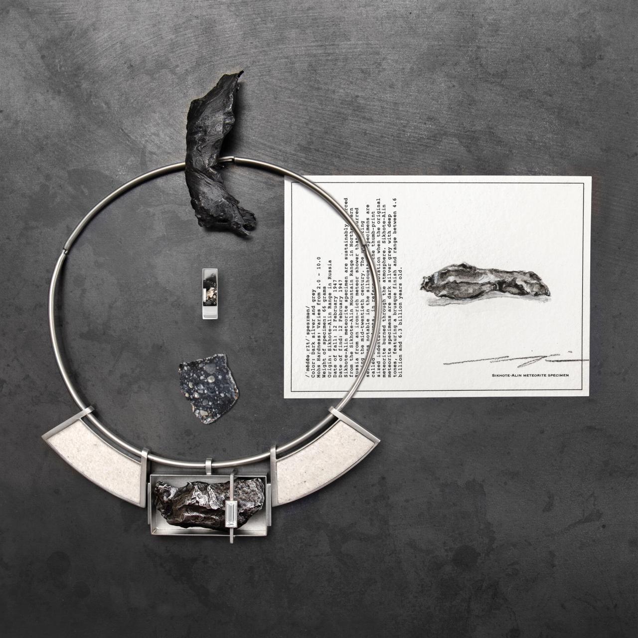 SB: Let’s start with the fact that your jewelry, objects, and sculpture work explore time, cosmic history, and geology. You have a fascinating mind when it comes to thinking about these sweeping, far-reaching temporalities. You’ve said that you like working with fossils because they’re capturing tens of thousands of years at a time, if not hundreds of millions of years at a time. How do you think about time in your work?