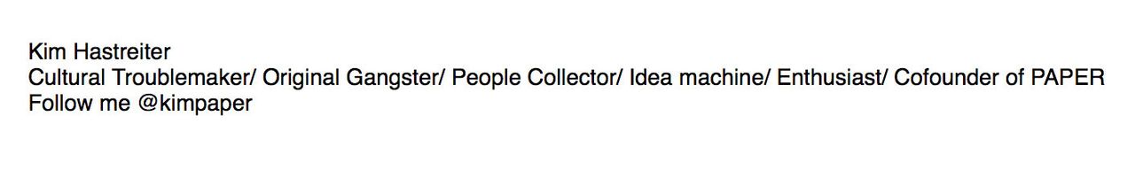 AZ: A couple days ago, I noticed your email signature that reads, “Kim Hastreiter: Cultural Troublemaker, Original Gangster, People Collector, Idea Machine, Enthusiast, and Co-Founder of Paper.” More formally, you’re known as a journalist, editor, publisher, and curator, but I want to start with the first one, which is “Cultural Troublemaker.” Where are you currently making trouble?
