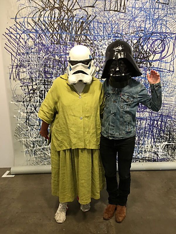 Hastreiter and Drew Elliot wearing masks by Creative Growth artist William Scott in front of a piece by Dan Miller, another Creative Growth artist.