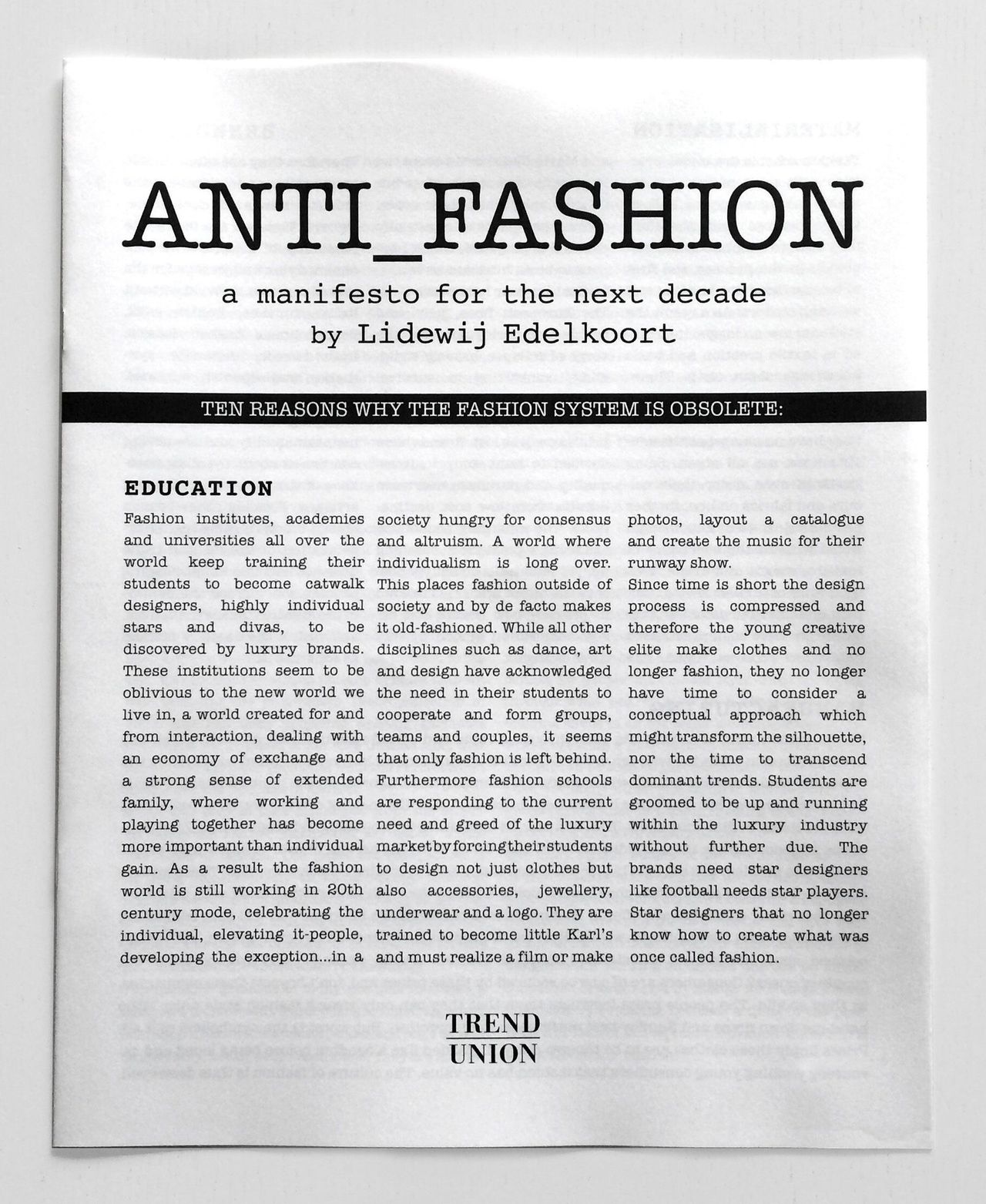 The cover of Edelkoort’s much-discussed Anti-Fashion Manifesto from 2014.