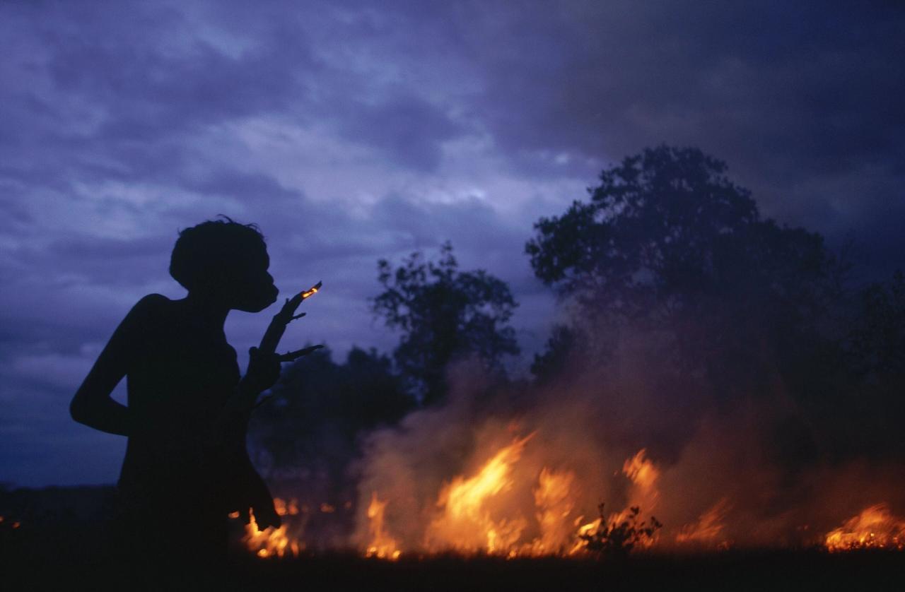 Aboriginal elder George Milpurrurr shows his children how to make a controlled fire. Australian Aboriginal boy utilizing fire-stick burning. (Courtesy Julia Watson)