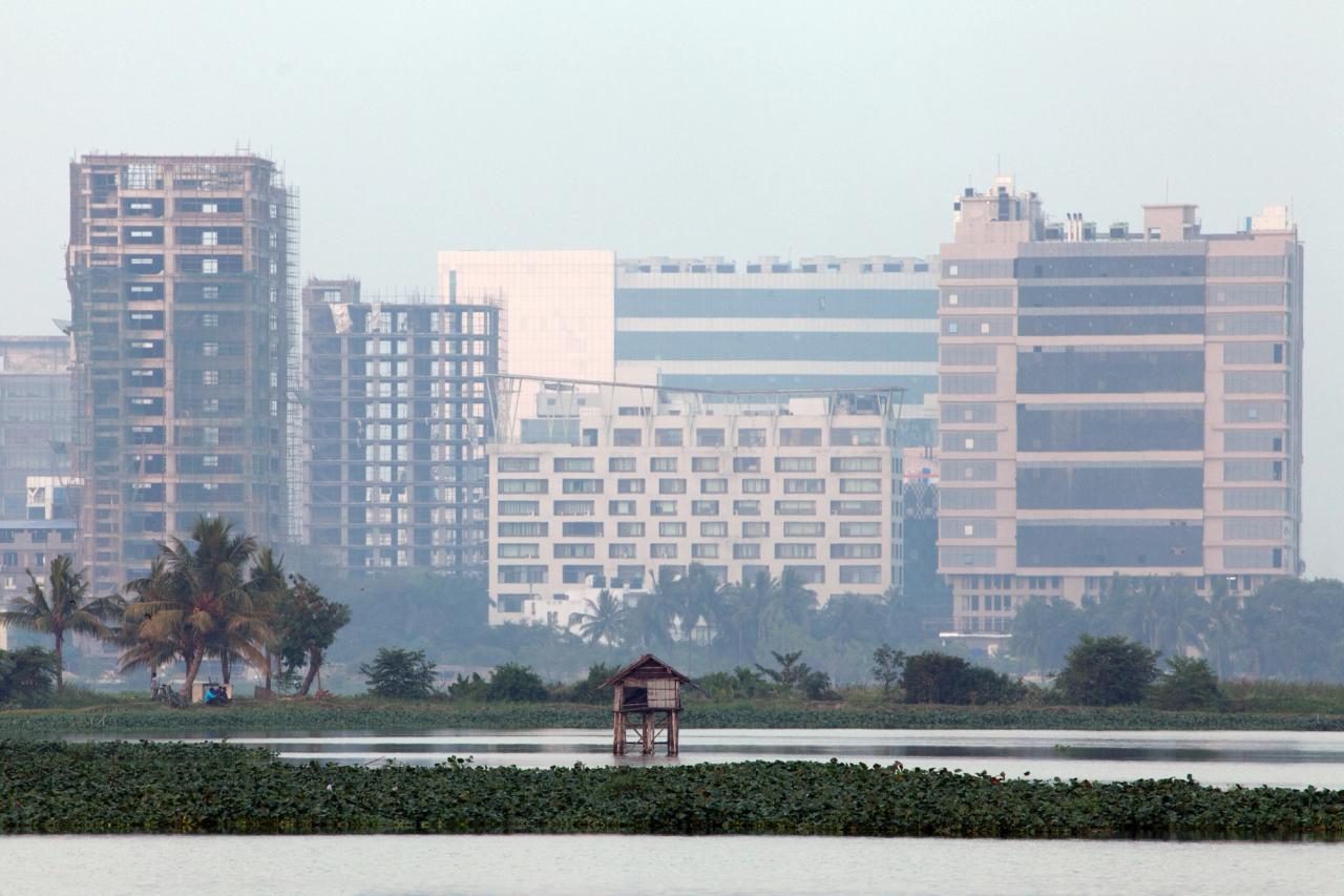 A small hut in the East Calcutta Wetlands in Calcutta, India. In the background is Salt Lake City, a planned satellite city in northeast Calcutta. (Courtesy Julia Watson)