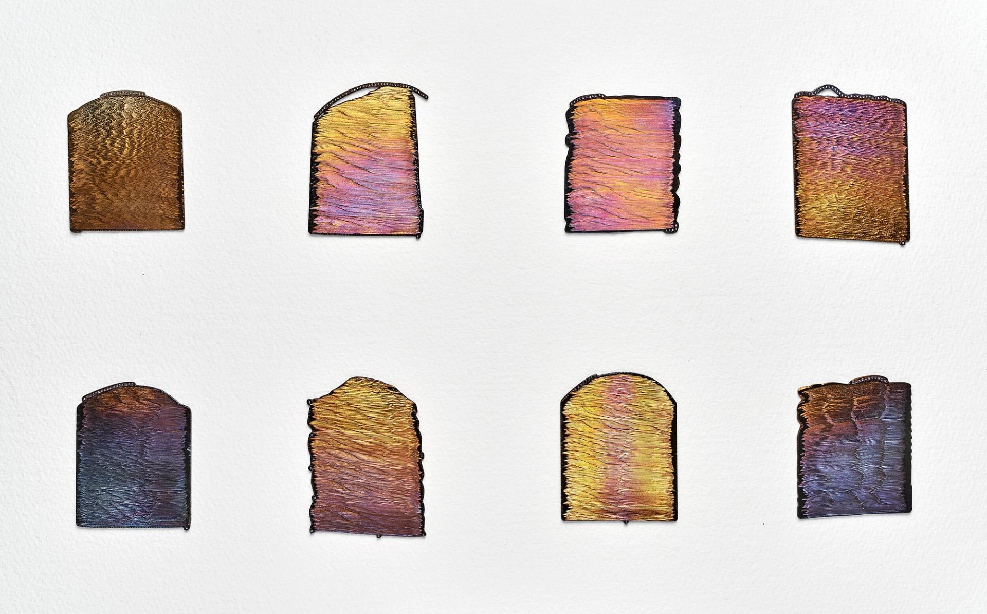 DB: The upcoming exhibit, which I guess I’ve been thinking about it and working on it for over twenty years, is thinking about Monet capturing the light. It’s about work I’ve been doing with aluminum and steel and gold, where there is no applied color, whatsoever. It is through the engraving and placement on the wall—they act almost as diffraction line gradings, giving back to the viewer purples and blues and colors that are not pigment colors. They’re intense light colors.