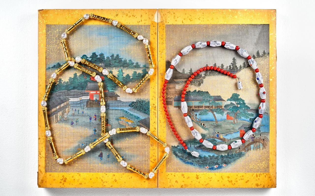 Two of Brush’s Amber Kingdom gem bead necklaces. (Courtesy Rizzoli Electa, Photo: Takaaki Matsumoto)