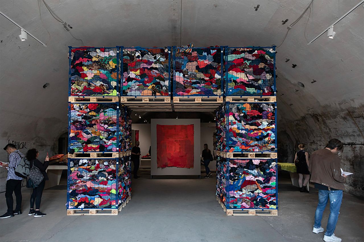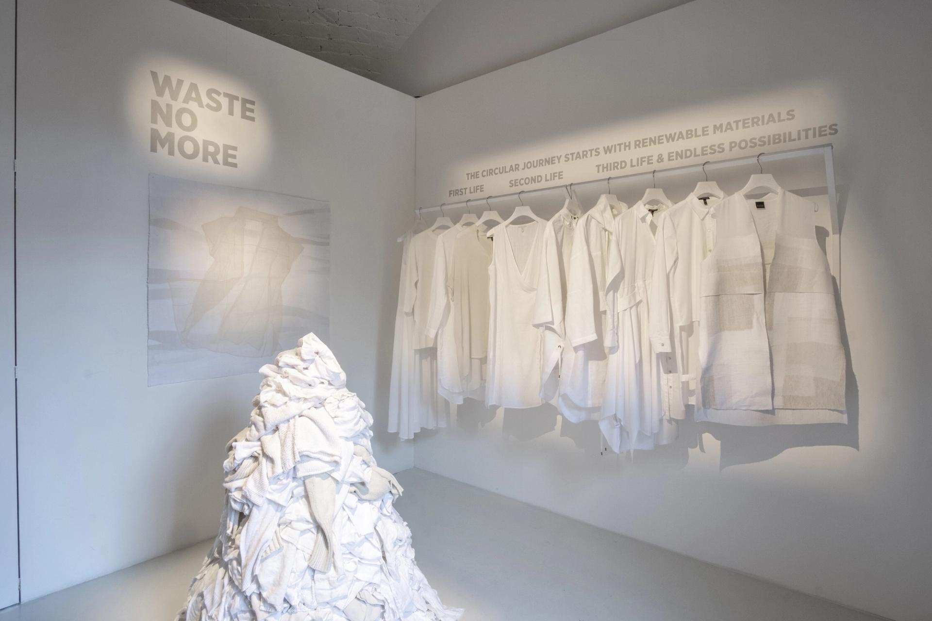 An exhibition about Waste No More, one of Eileen Fisher's textile recycling initiatives, during Milan’s Salone del Mobile design and furniture fair in 2019. (Courtesy Eileen Fisher)
