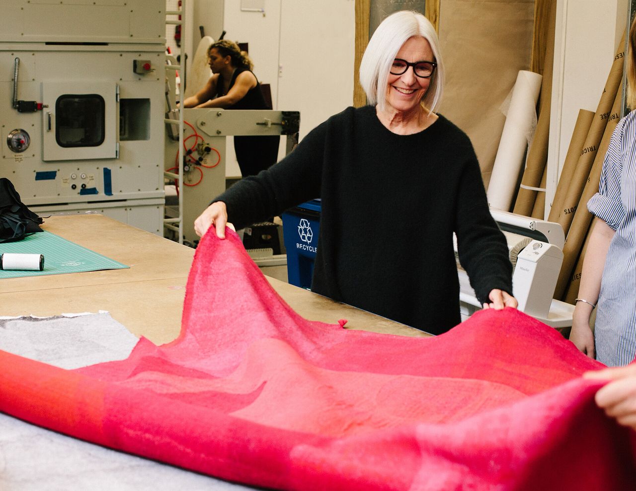 Fisher at the Tiny Factory with a textile made from felted-together recycled garments. (Courtesy Eileen Fisher)