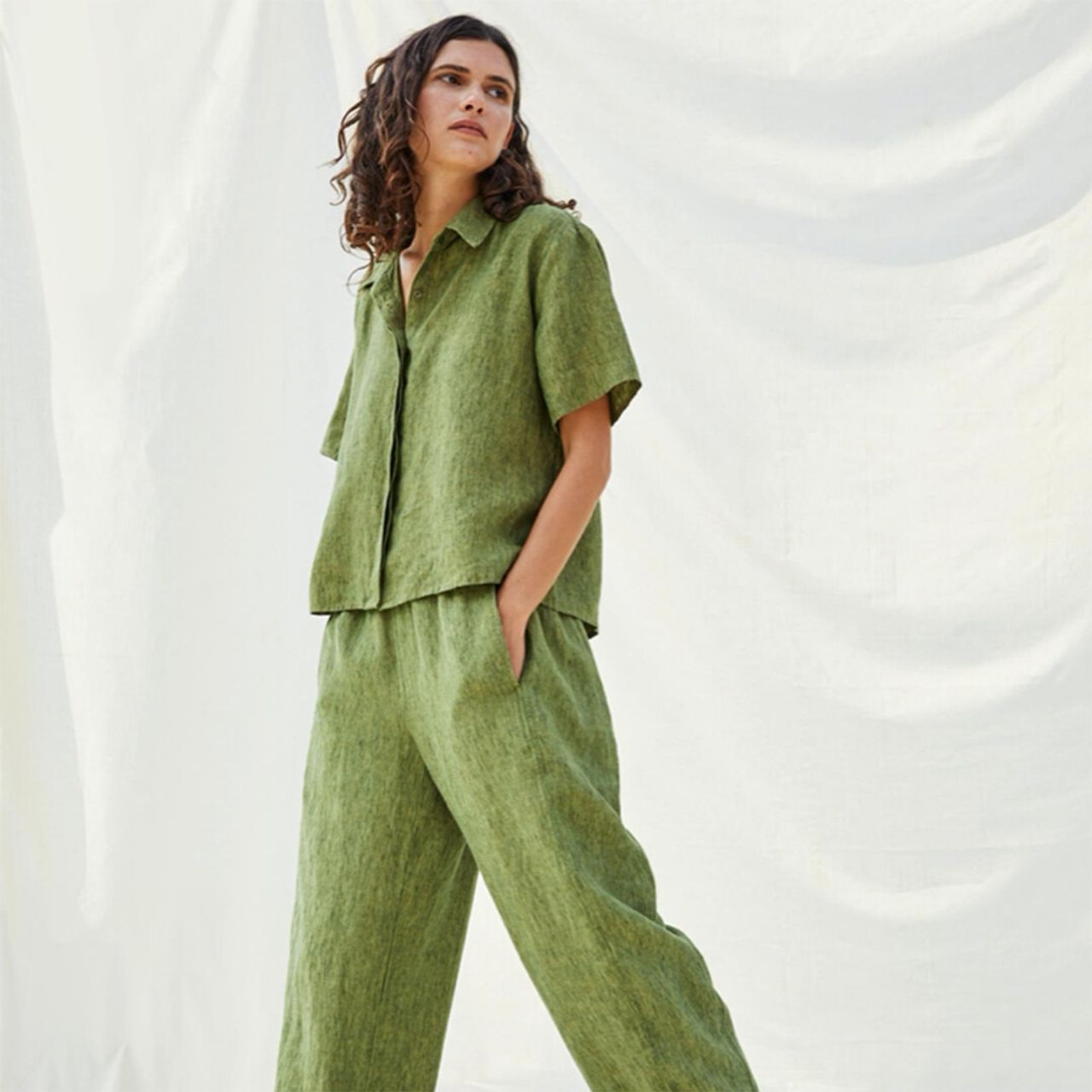 Washed organic linen short-sleeve shirt and lantern pant from Eileen Fisher’s spring/summer 2021 collection. (Courtesy Eileen Fisher)