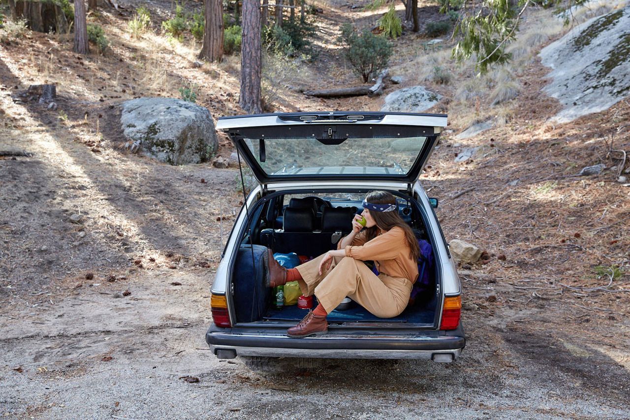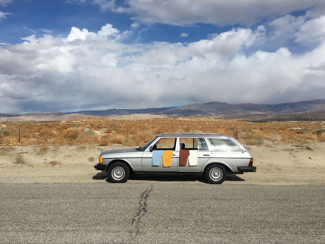 “Kamm Pants” laying out over the windows of a car in the desert.