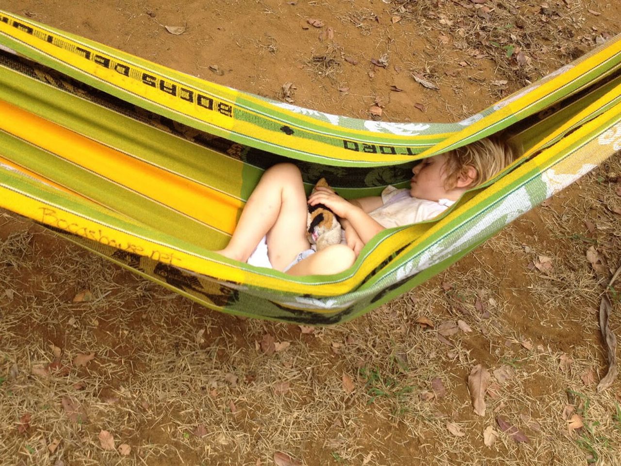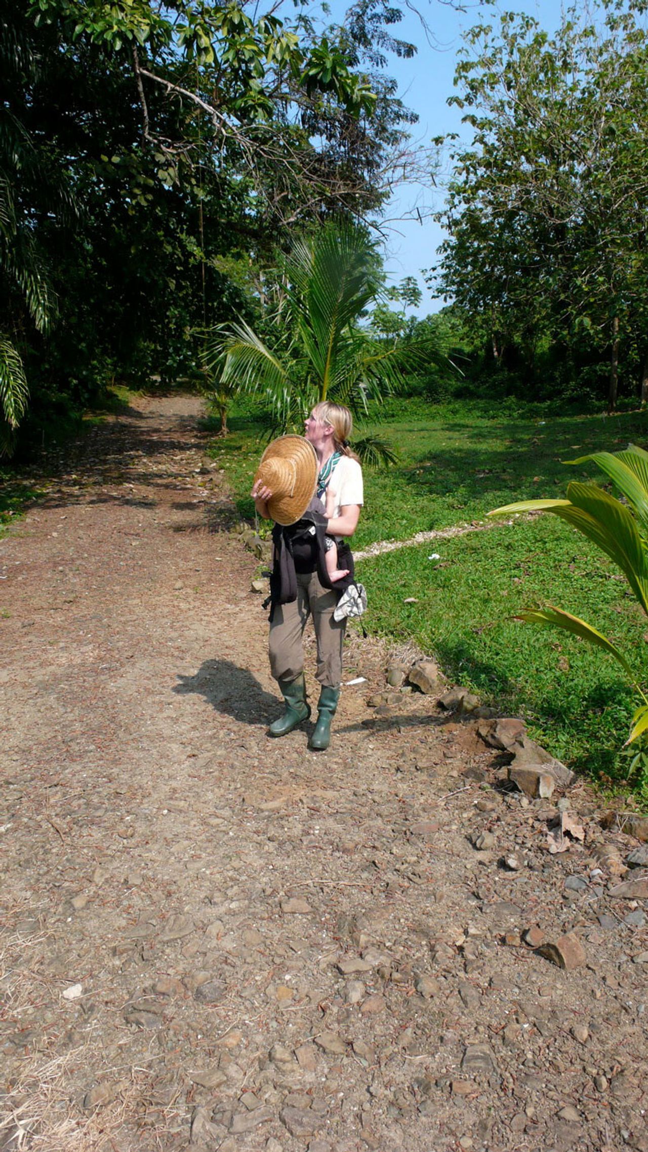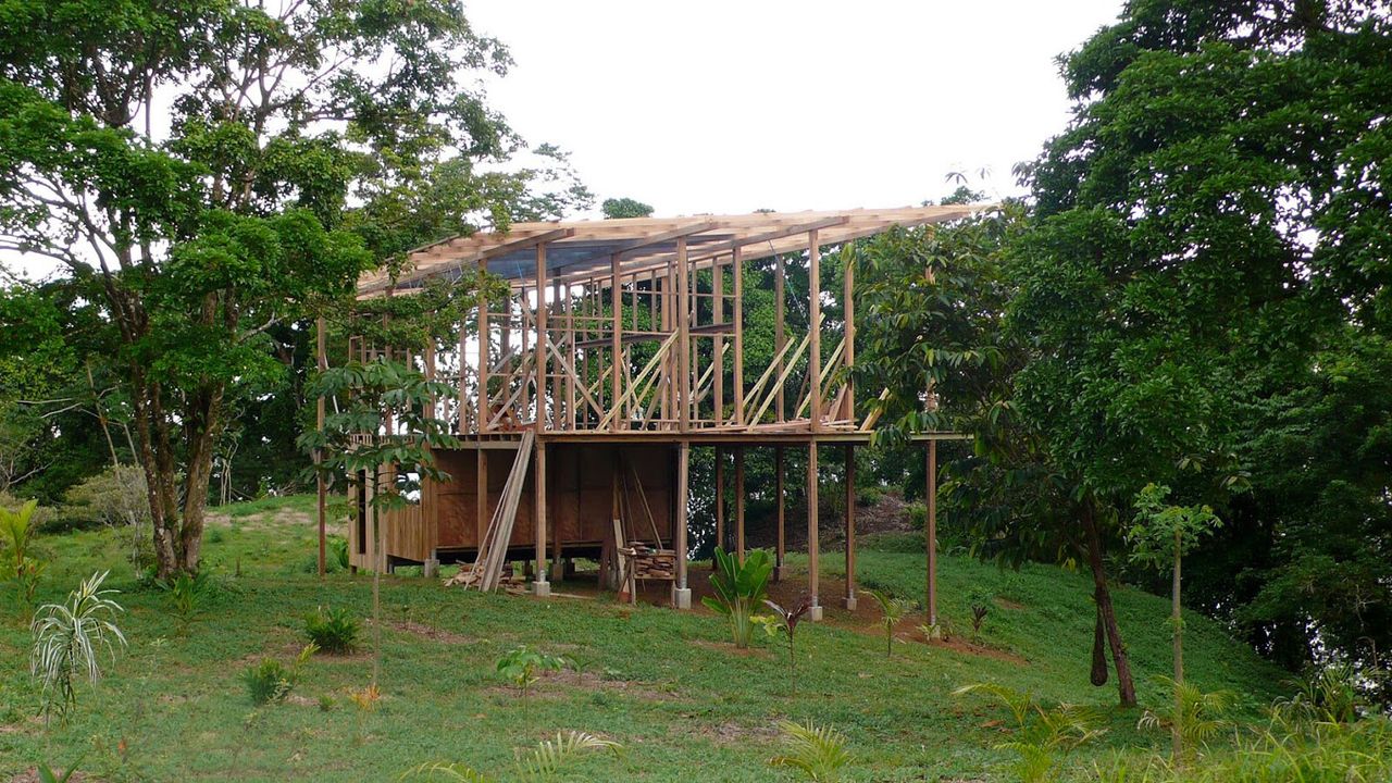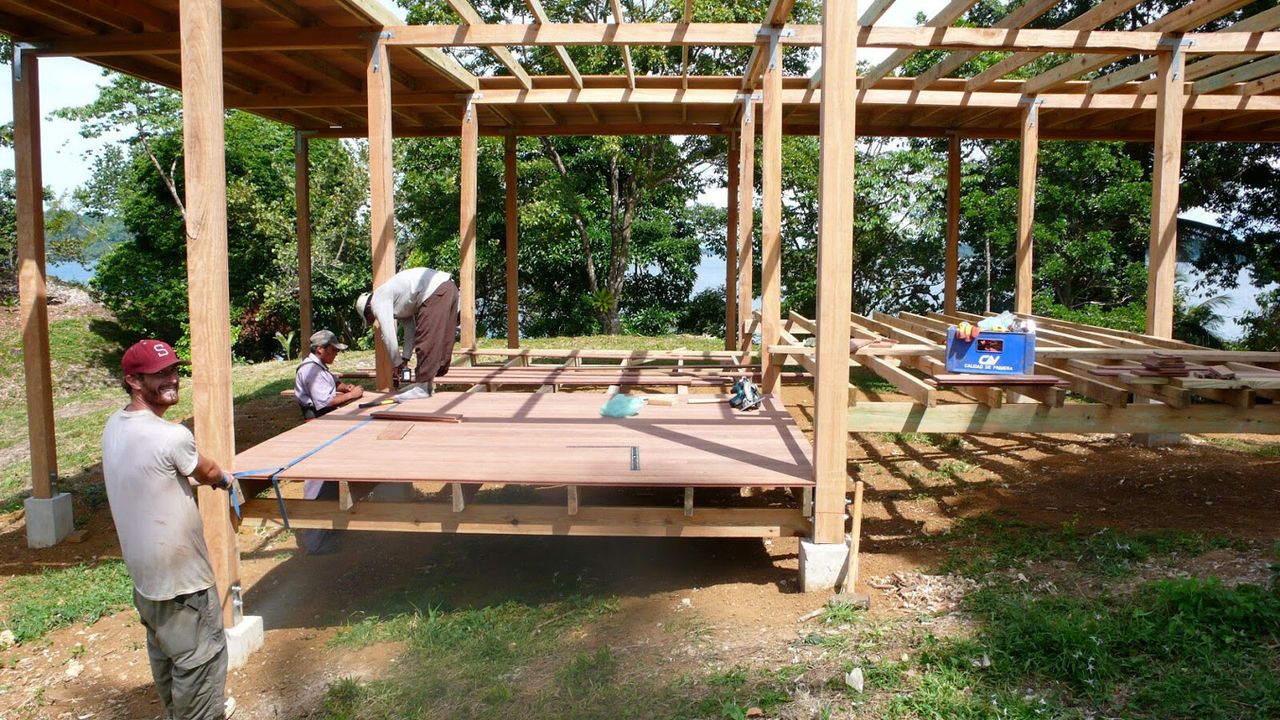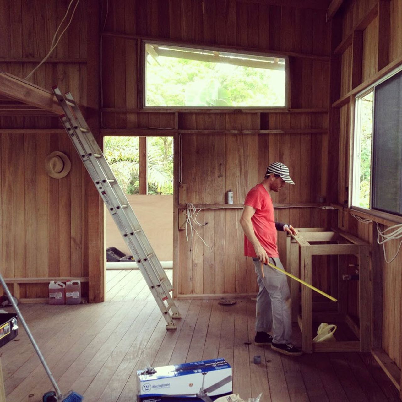 Kamm and her handy helper, Julien, mid-construction on their house in Panama.