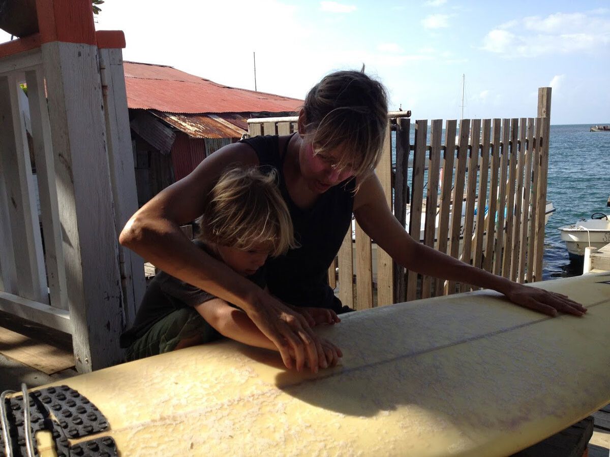 Kamm and her son, Julien, working on a surfboard in Panama.