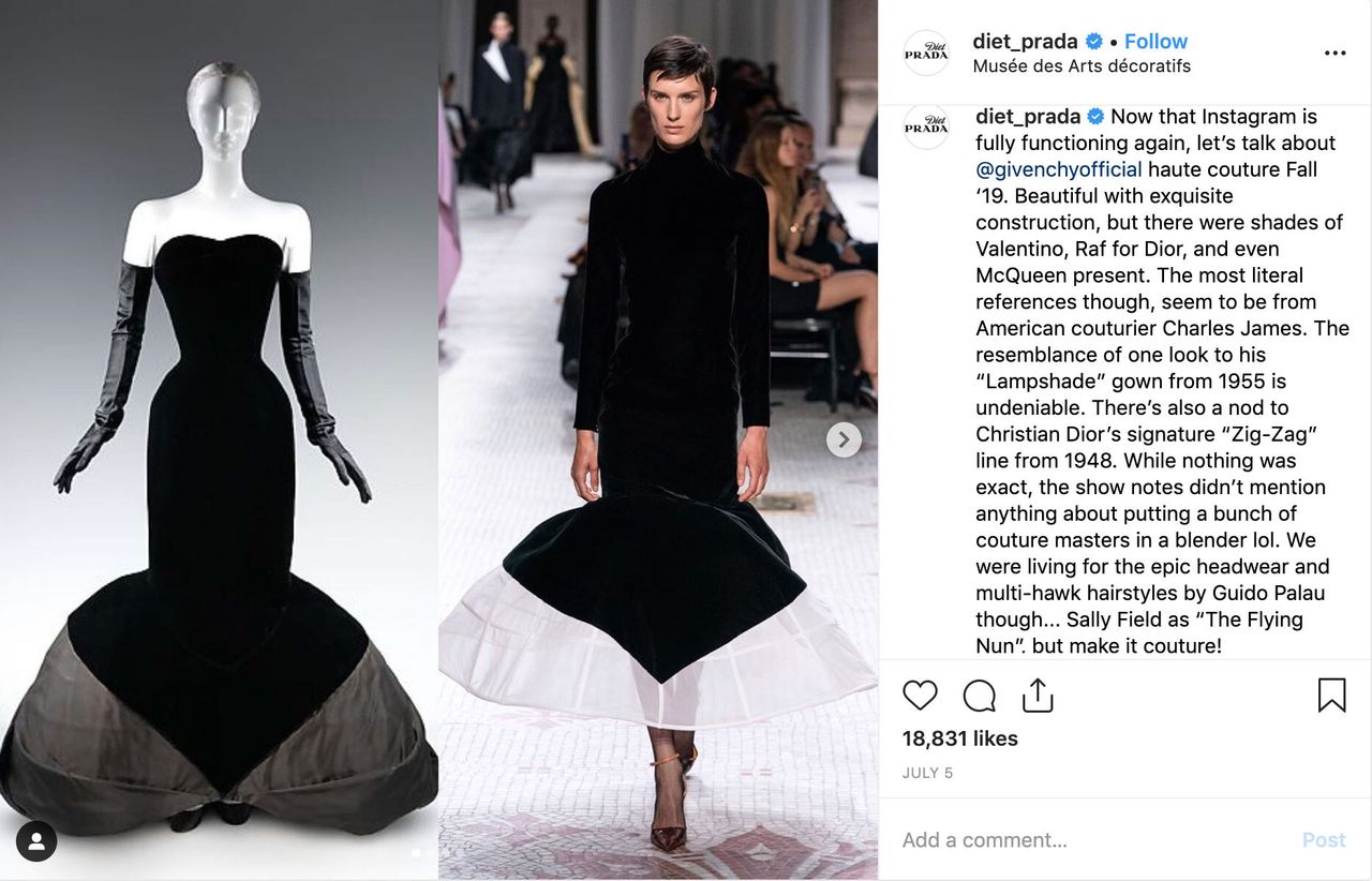 A post on the @dietprada Instagram account, calling out a Balenciaga look from the label’s fall 2019 haute couture collection.