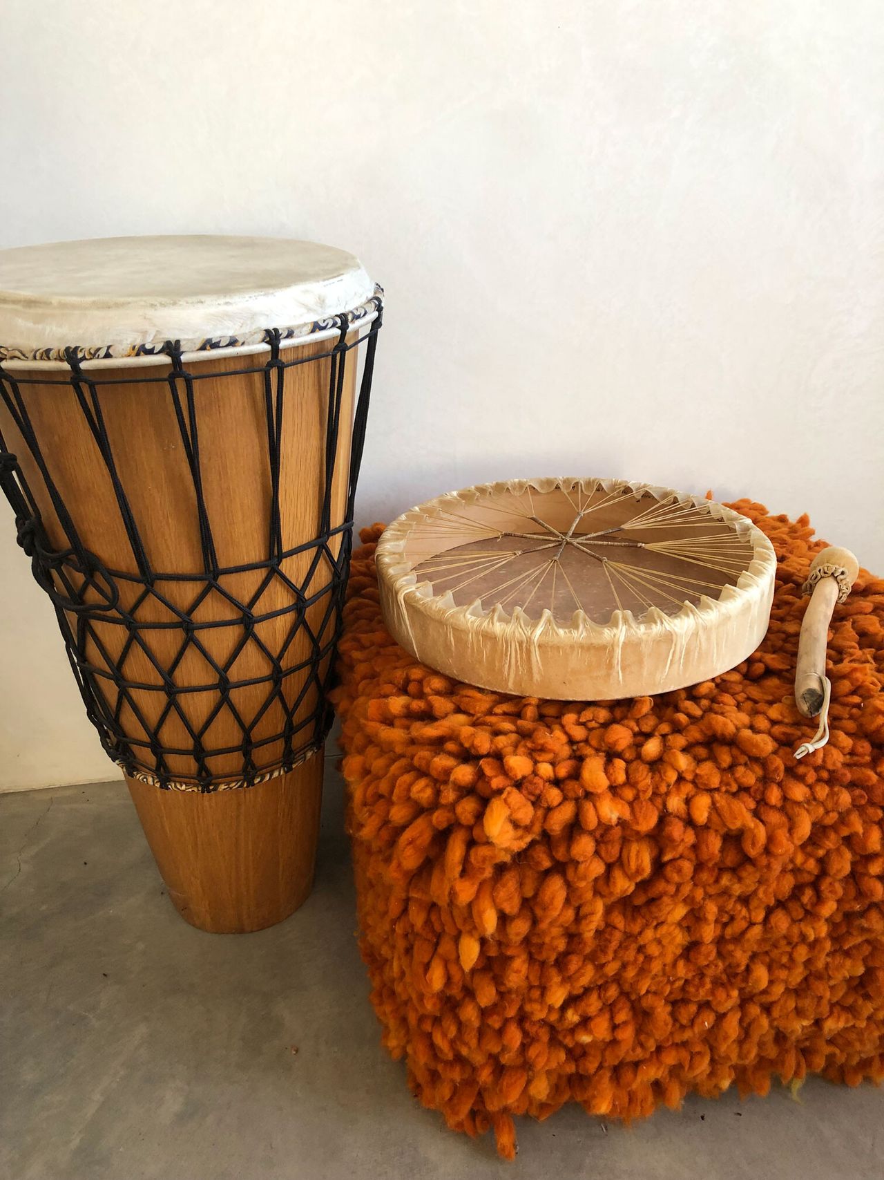 An animal hide drum that Ross made herself and an African drum in Ross's sound studio.