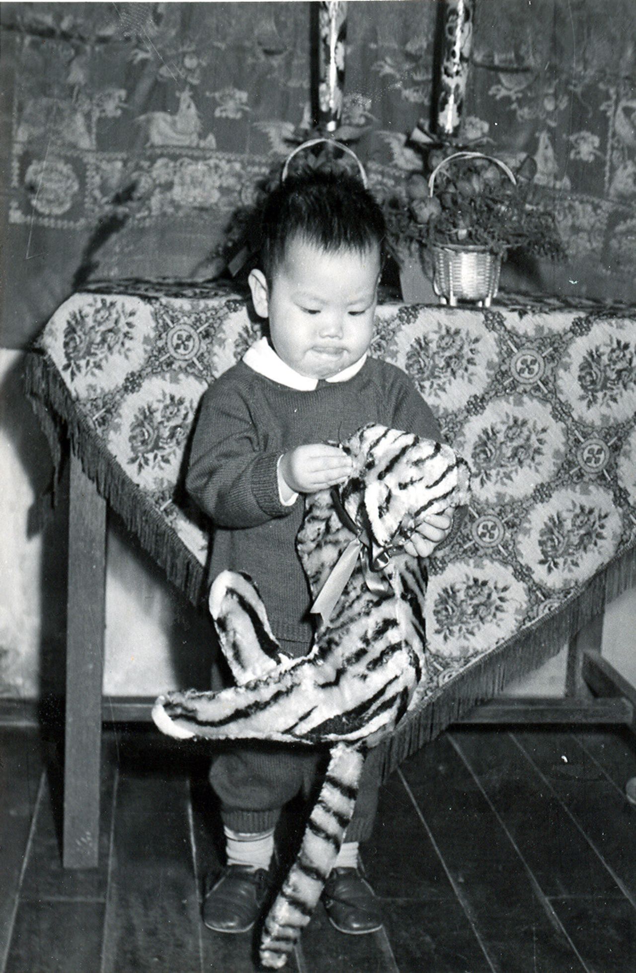 Lee, age 2, with a stuffed toy tiger.