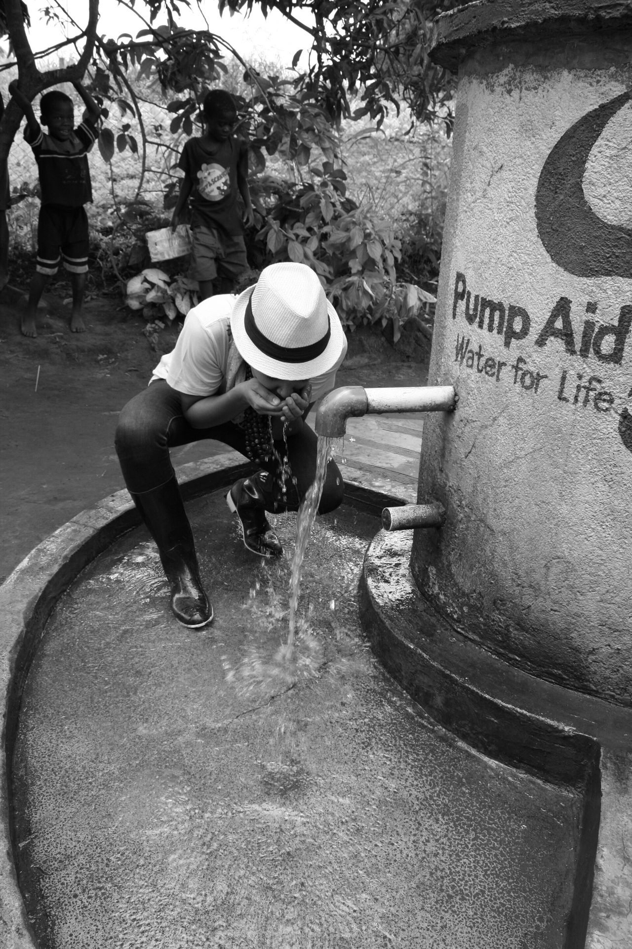 Péan in Malawi, drinking from a clean water well created by Charity: Water. (Courtesy Monique Péan)