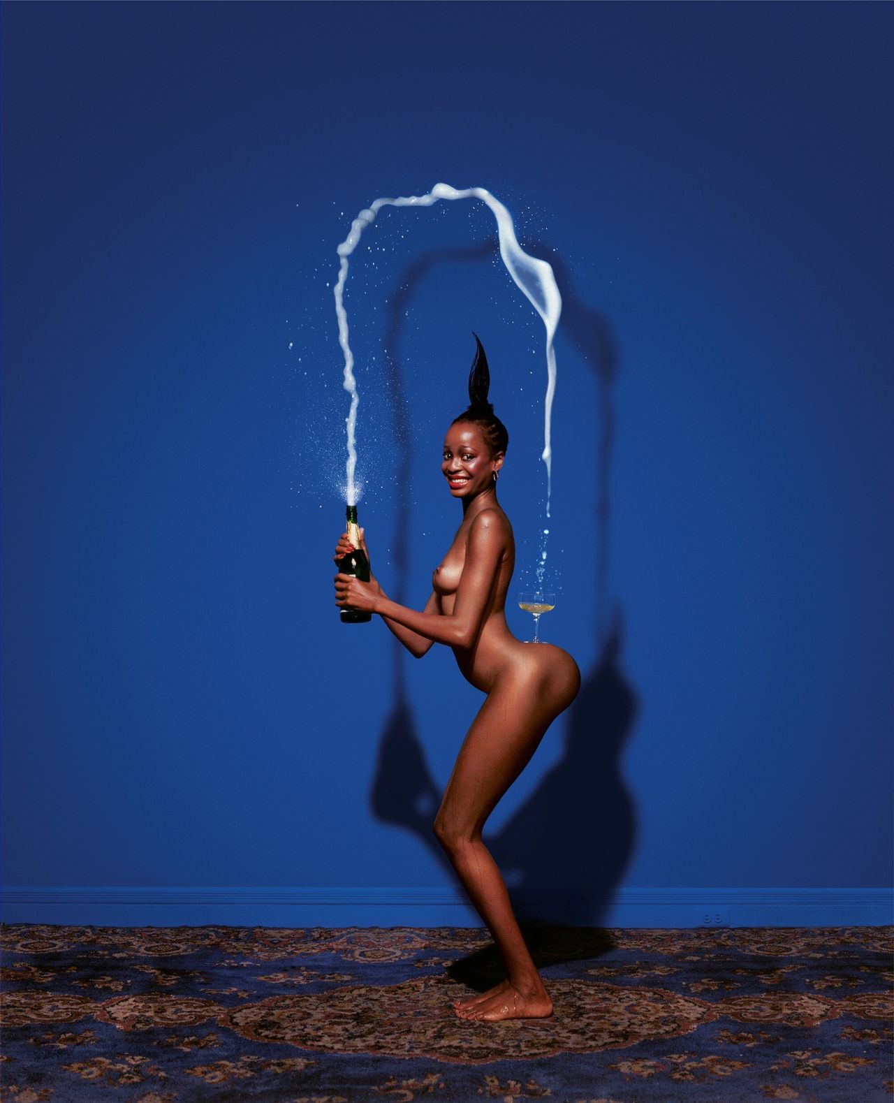 So we were really lucky, and Kim came to the shooting. Mickey [Boardman], Drew, Jean-Paul, his assistant, Kim, and she just brought her makeup and hair. And that was it! There were no cockblockers there. So Kim, who was really nice, she was just game. And she also always has to approve the photographer, but someone told her, I forget who—maybe Kanye said, “Oh, Jean-Paul Goude’s good,” because he did the Chanel, you know. So they approved using him, which … thank God. I mean, literally, Mickey called me and said, “She just took off all her clothes.” And Jean-Paul does these drawings, and he has it all prepared, he wanted to redo that shot of the champagne.