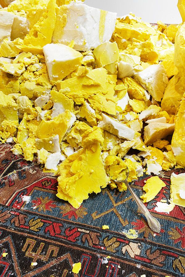 My studio manager Alex studied and got a master’s degree recently in psychology, and she was telling me about creativity and how some people define [it]. She said that sometimes creativity can be defined by people who have a willingness to put things together that are unexpected to be combined, that are not pragmatic in their combination, and as a result, something interesting is born of these, kind of, connections, or “collisions,” I guess I would think they call them, and putting shea butter together with the things that I was putting it next to felt like these very contemporary collisions. I guess in that way it felt deeply creative.