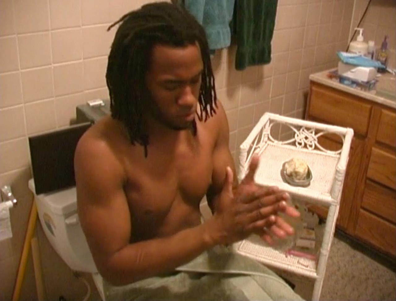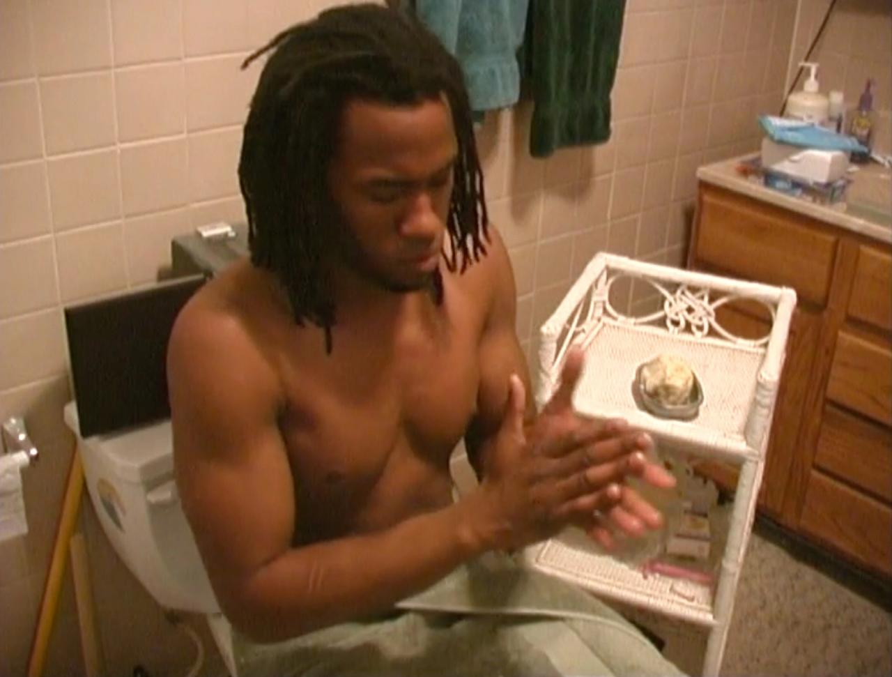 Still from “Me, Tavis Smiley & Shea Butter” (2004). (Courtesy the artist, David Kordansky Gallery and Hauser & Wirth)